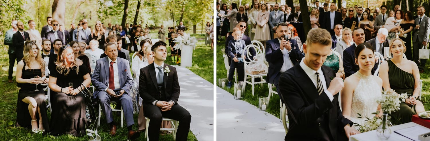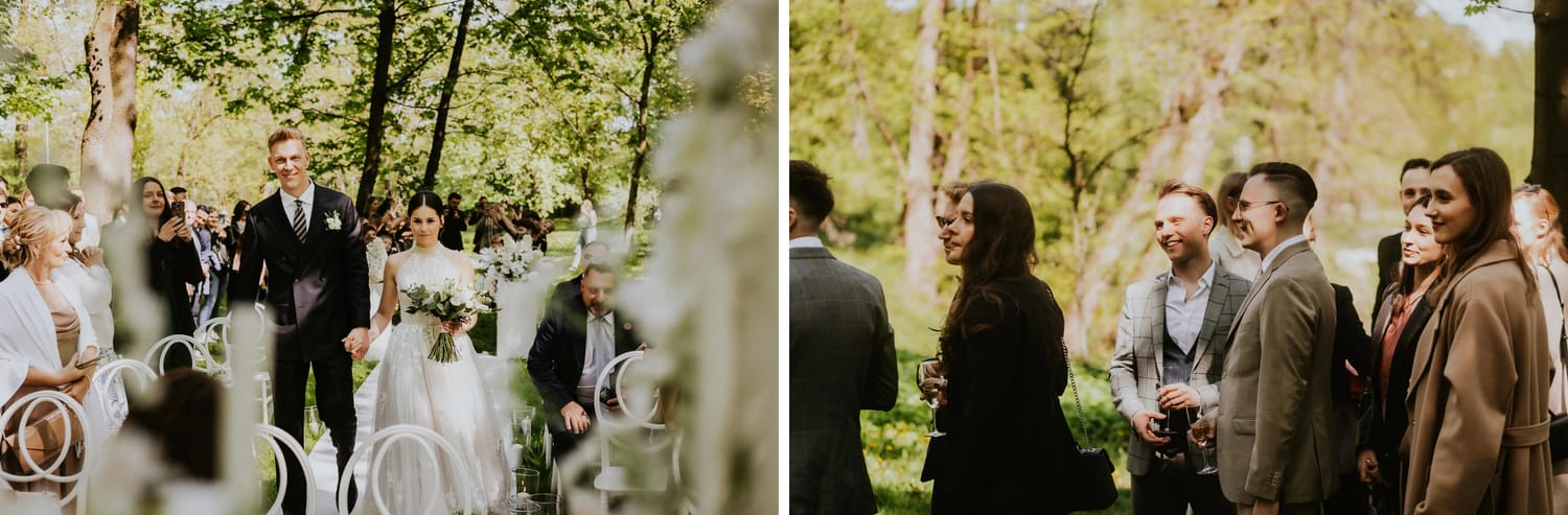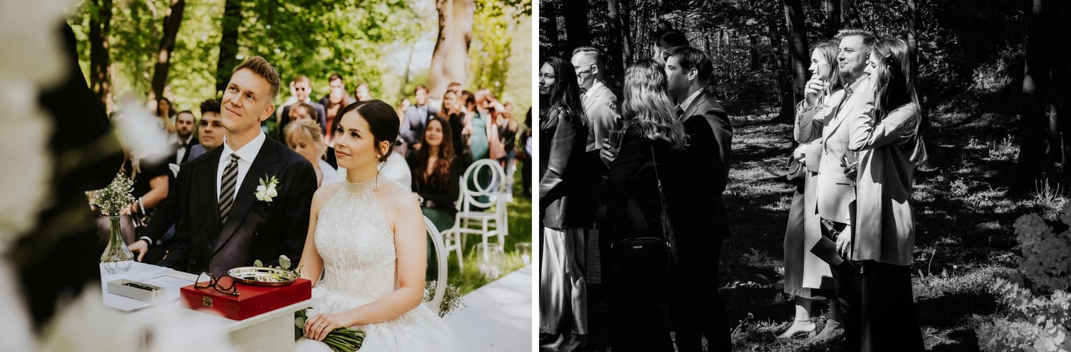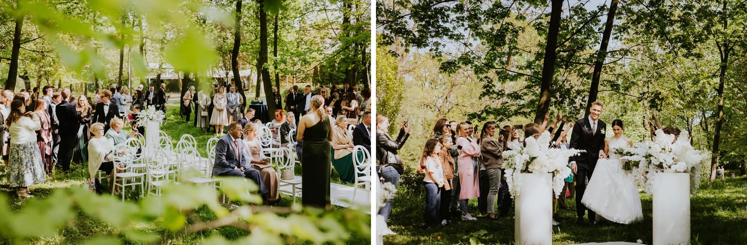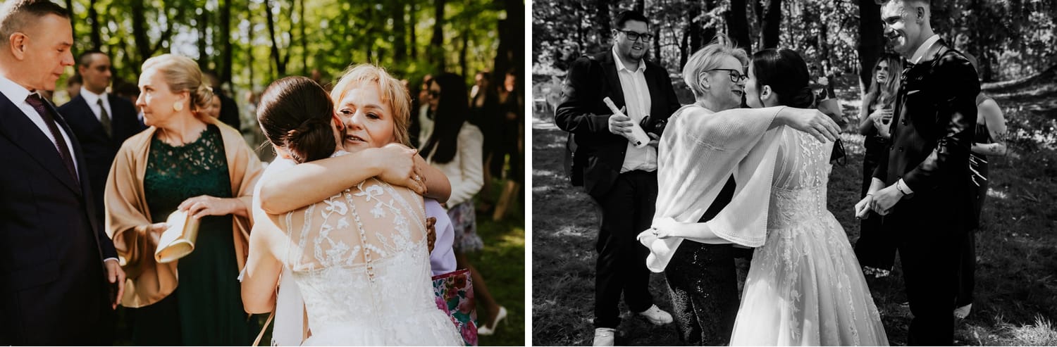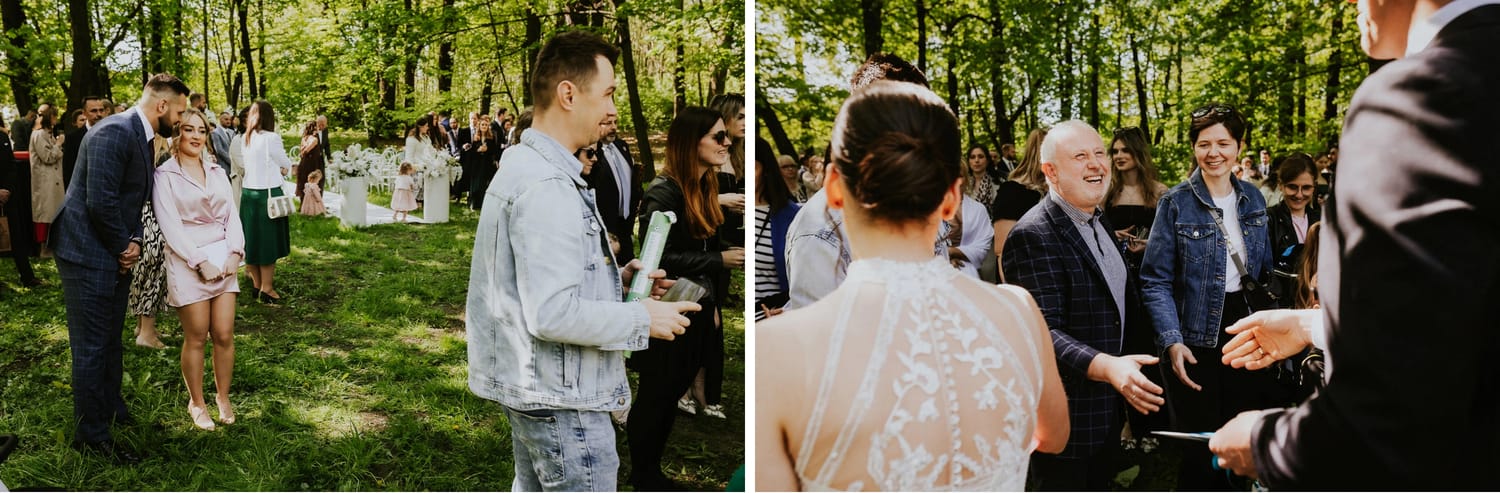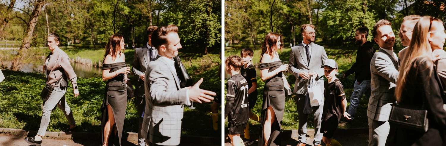 Po ceremonii przychodzi moment, który wielu parom umyka w emocjach: życzenia. W parku to działa dobrze, bo nie ma ścisku w korytarzu. Ludzie mają miejsce, żeby podejść, powiedzieć coś swojego, zostać chwilę dłużej. Dla mnie to jest ważny fragment, bo na tych zdjęciach często widać osoby, które na parkiecie są mniej „głośne”, ale w życzeniach są najbliżej.