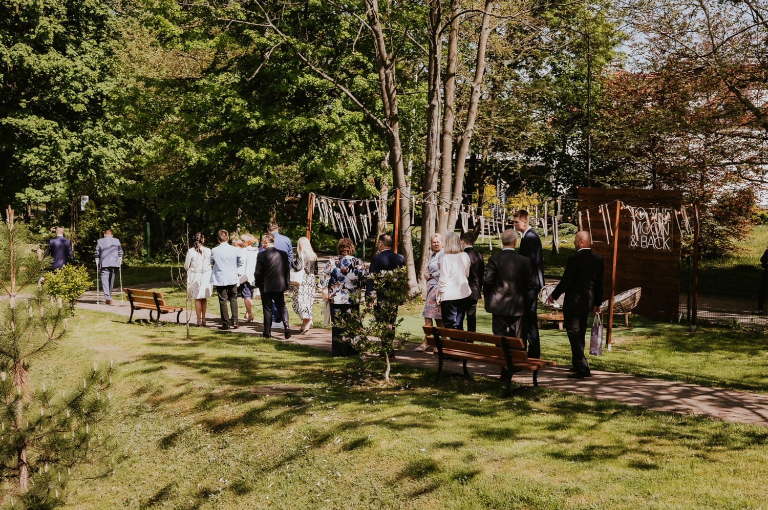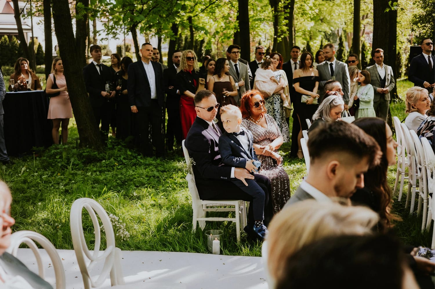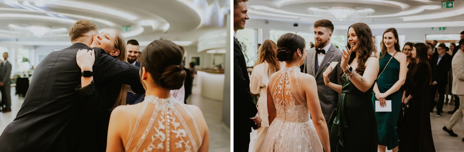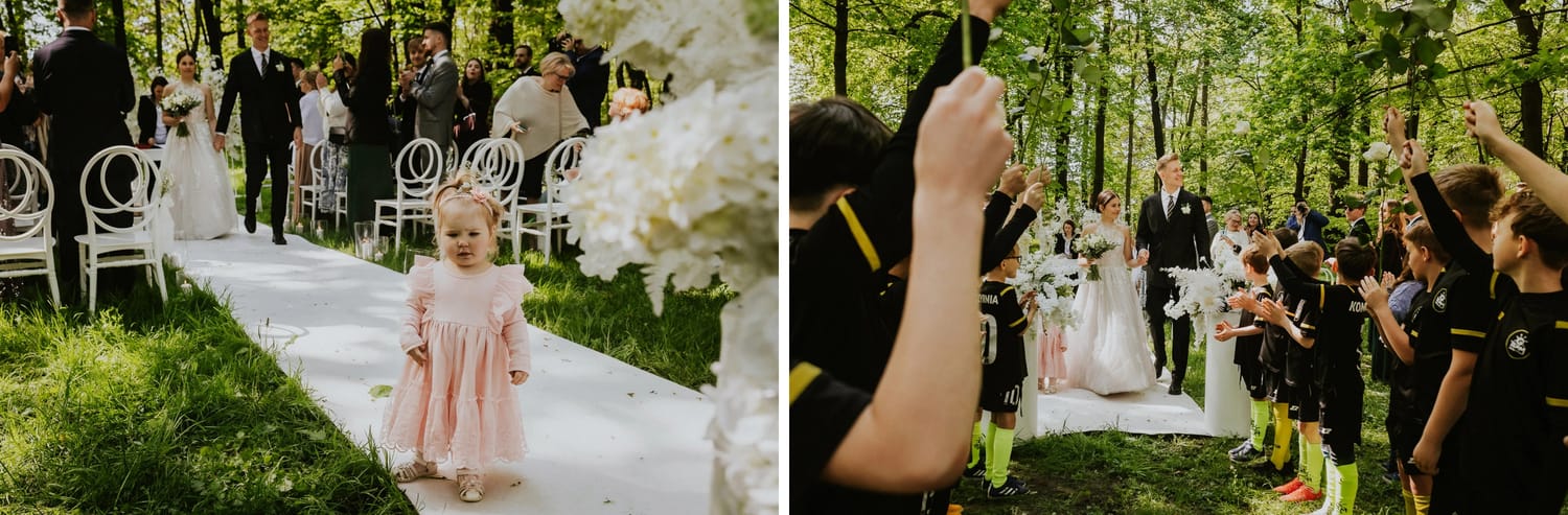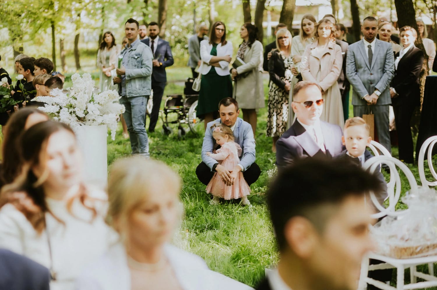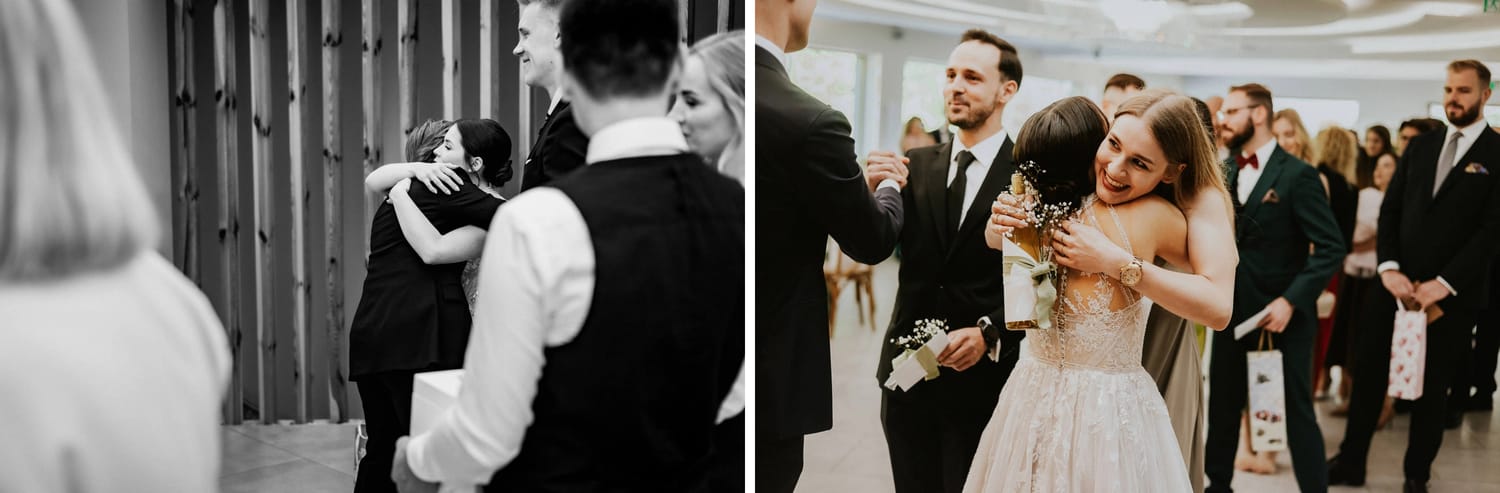 Po ceremonii przychodzi moment, który wielu parom umyka w emocjach: życzenia. W parku to działa dobrze, bo nie ma ścisku w korytarzu. Ludzie mają miejsce, żeby podejść, powiedzieć coś swojego, zostać chwilę dłużej. Dla mnie to jest ważny fragment, bo na tych zdjęciach często widać osoby, które na parkiecie są mniej „głośne”, ale w życzeniach są najbliżej.