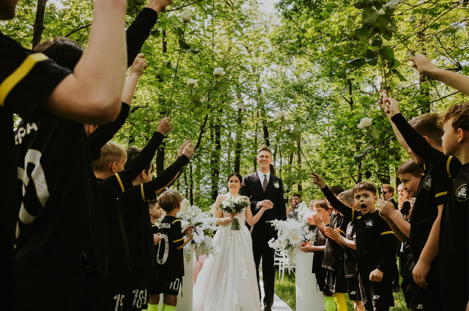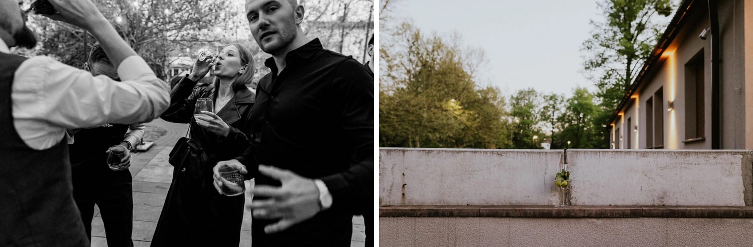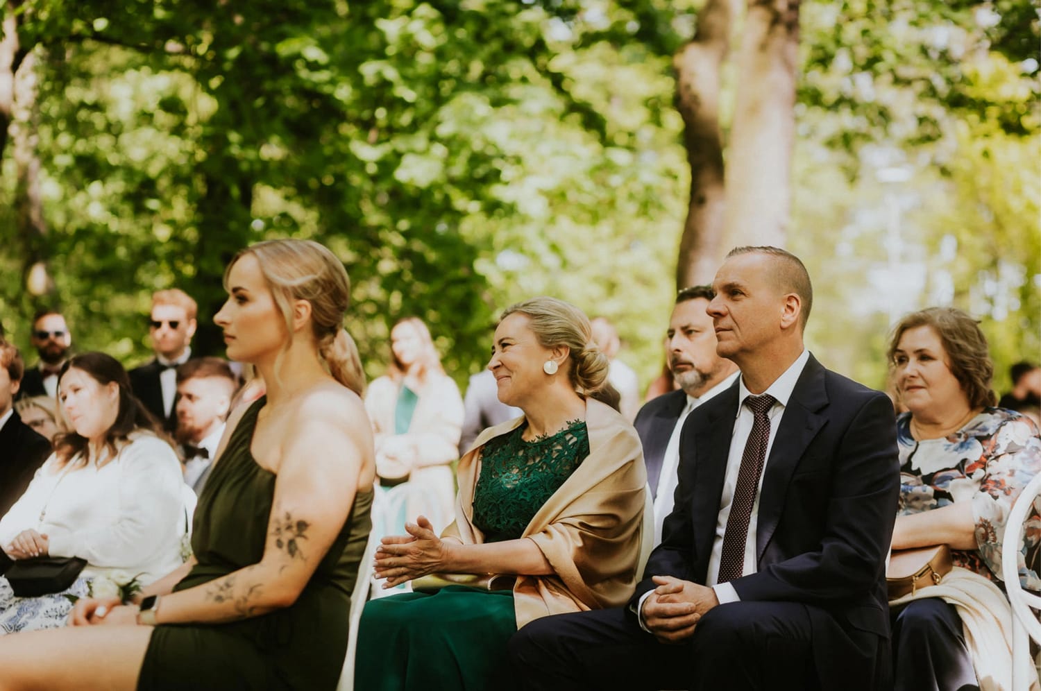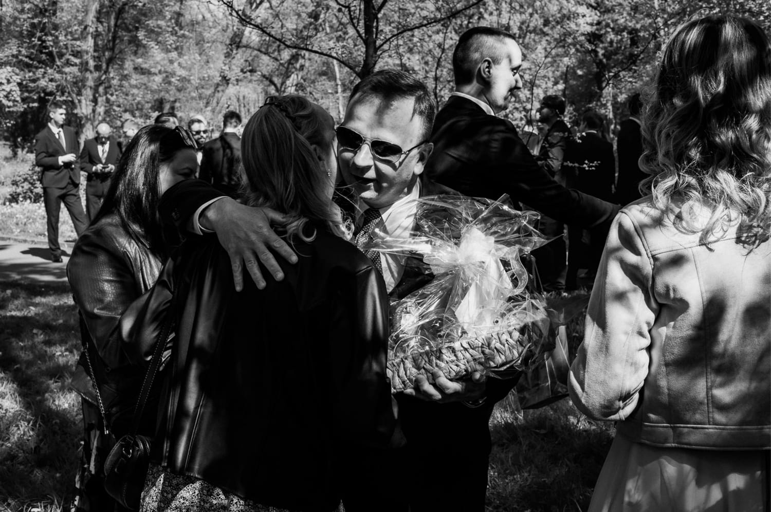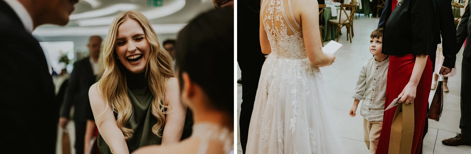 Po ceremonii przychodzi moment, który wielu parom umyka w emocjach: życzenia. W parku to działa dobrze, bo nie ma ścisku w korytarzu. Ludzie mają miejsce, żeby podejść, powiedzieć coś swojego, zostać chwilę dłużej. Dla mnie to jest ważny fragment, bo na tych zdjęciach często widać osoby, które na parkiecie są mniej „głośne”, ale w życzeniach są najbliżej.