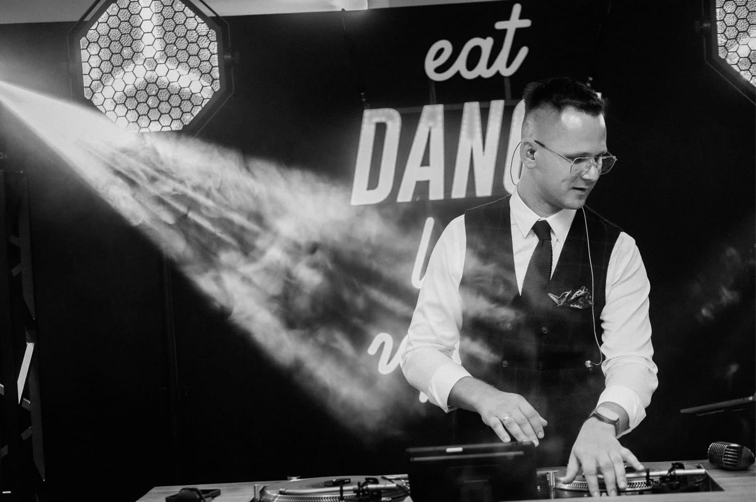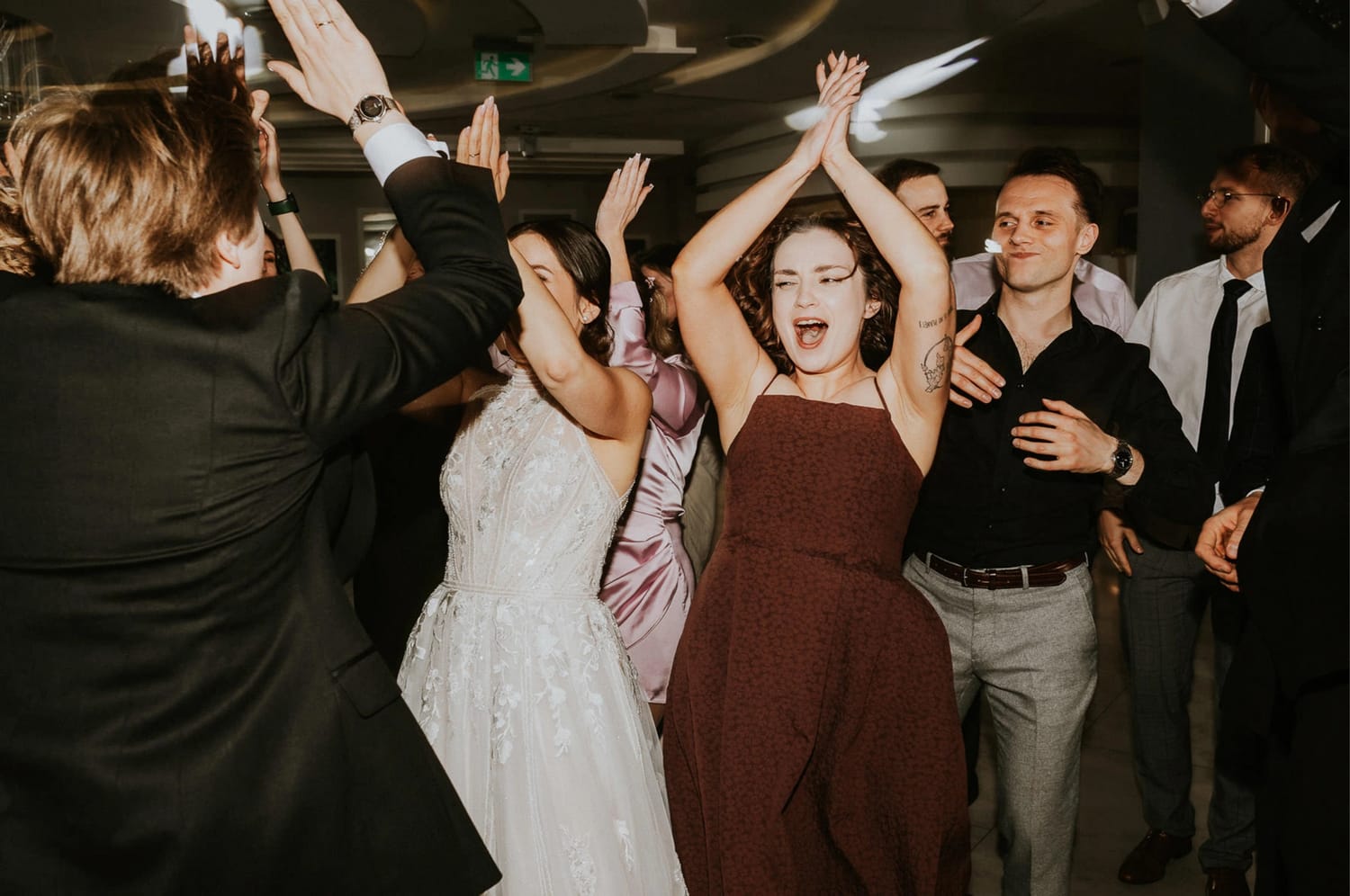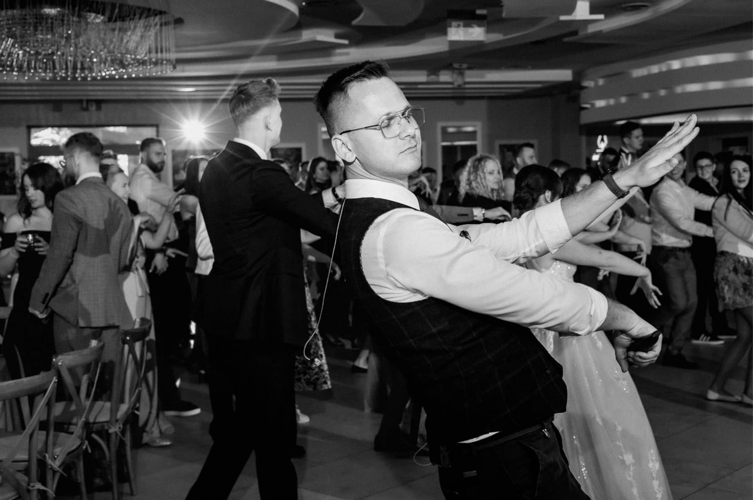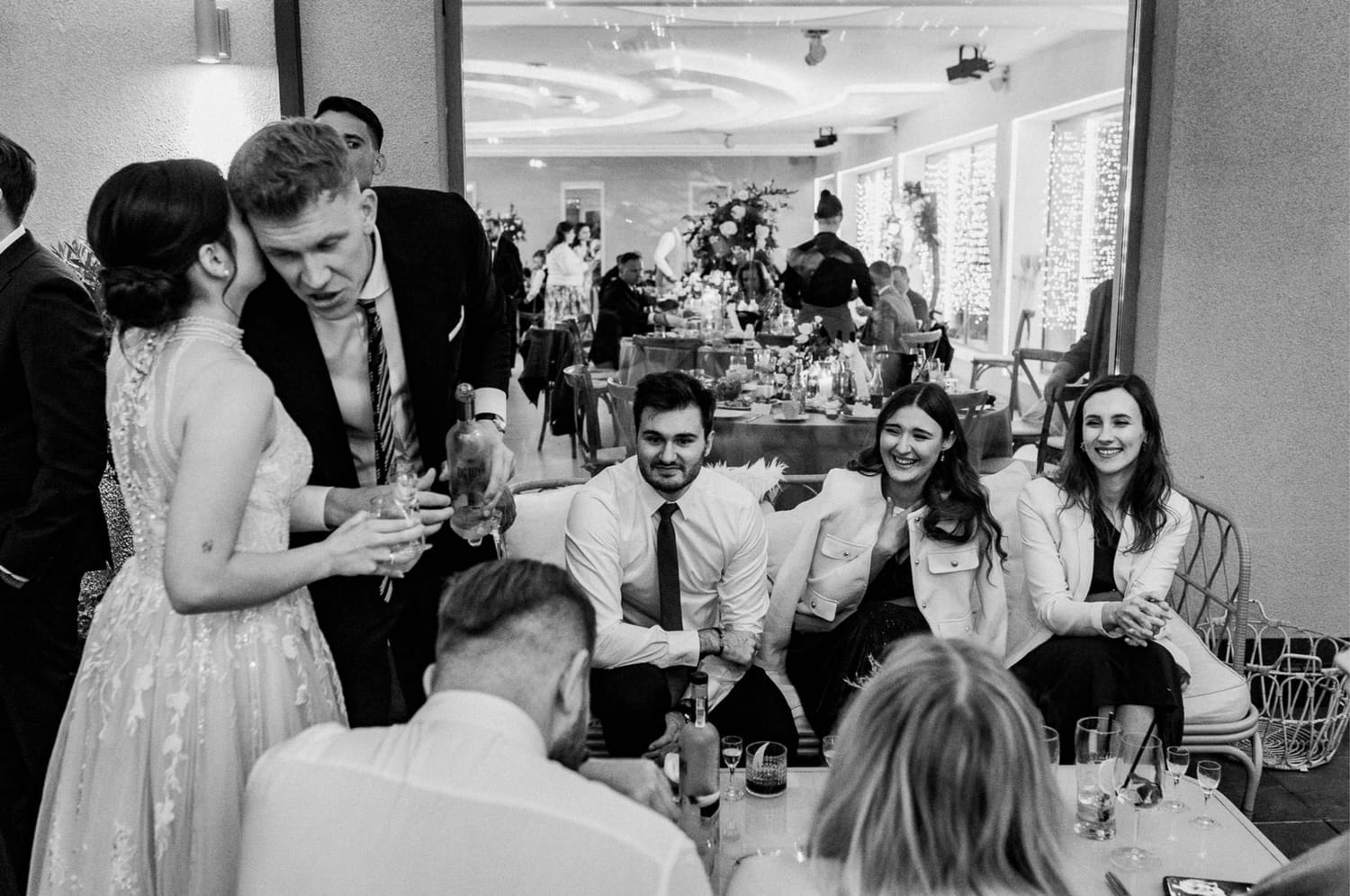 Wesele prowadził DJ Szanowny. Ja nie opisuję DJ-ów jak recenzent w Google, ale jedno powiem wprost: kiedy prowadzenie ma wyczucie, zdjęcia wychodzą lepiej. Bo ludzie nie są ciągle wybijani z rytmu. Impreza żyje, rozmowy przy stołach też żyją, a ja mogę łapać to, co najciekawsze: reakcje, gesty, krótkie spotkania przy barze, śmiech, który wybucha nagle i wcale nie na środku parkietu.